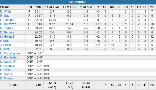 Devant de jusqu’à 18 points, les Spurs (29 passes décisives, soit 5 au-dessus de leur moyenne en saison, 11 rien que dans le 1er quart-temps) étaient devant au score à la fin de chaque quart-temps malgré presque 3 minutes passées sans marquer au milieu du 2ème quart avant de boucler la 1ère mi-temps sur un 10-3 pour mener 55-53 à la pause.