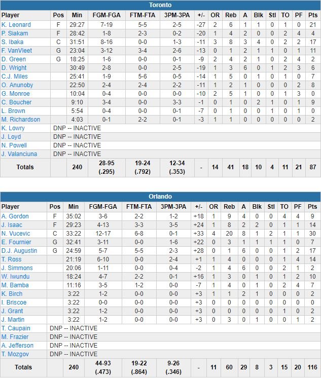 Vucevic a marqué 12 points durant un 21-6 en fin de 1ère mi-temps, D.J. Augustin 6 points d’affilée pour prendre 17 points d’avance à 8’15 de la fin du 3ème. Les Raptors ont terminé à 29.5% aux tirs. Aaron Gordon a signé 9 points à 3/6, 9 rebonds, 4 passes et a aussi fait du bon boulot défensif sur Leonard. Kyle Lowry (dos) n’a pas joué.