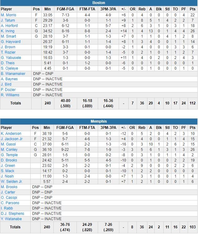 Marcus Morris a signé 22 points pour Boston, Gordon Hayward 14 en sortie de banc. Mike Conley a terminé meilleur marqueur des Grizzlies (à 64.9% de réussite en 1ère mi-temps) avec 26 points (9/22, 5 rebonds, 6 passes), devant Dillon Brooks et ses 19 unités. Marc Gasol a fini à 15 points (6/11, 10 rebonds, 6 ballons perdus), tout comme Jaren Jackson Jr.. Guerschon Yabusele (3 points à 1/3, 4 rebonds, 2 contres, 4 fautes) a battu son record de minutes cette saison avec 16, profitant de la fatigue d’Horford, revenu le 23 décembre d’une absence de 7 matchs pour une blessure au genou.