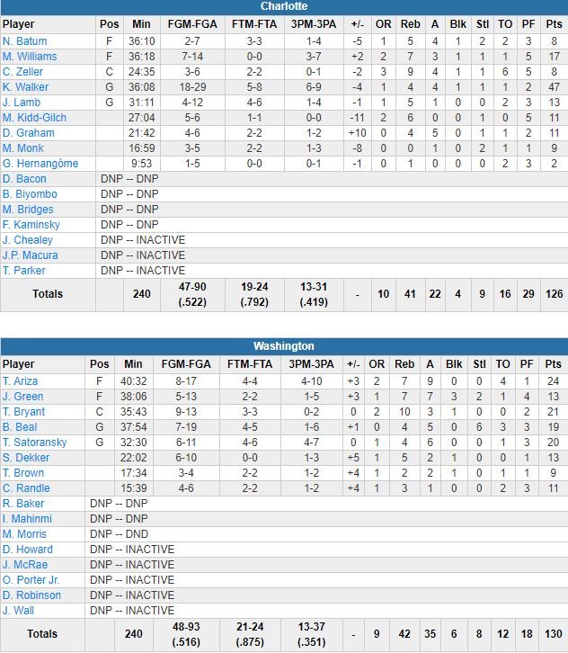 47 points de Kemba Walker (18/29, 6/9 à 3-points, 4 rebonds, 4 passes) dont 24 dans le dernier quart-temps face à des Wizards sans John Wall, victoire des Hornets n’est-ce pas ? Et bien non. Avec 7 joueurs à au moins 10 points dont Trevor Ariza à 24 points (8/17, 7 rebonds, 9 passes) et Thomas Bryant (21 points à 9/13 et 10 rebonds), Washington (3ème victoire en 12 matchs) s’en est sorti de justesse mais s’en est sorti. Devant 125-116, Washington s’est fait peur dans les 25 dernières secondes. Entre un lancer de Walker suite à une technique, 2 de Cody Zeller et 3 shoots réussis par Walker dont un 3-points pour revenir à 127-126, Ariza a finalement sauvé la mise en rentrant le panier plus la faute (de Walker) pour tuer le match.