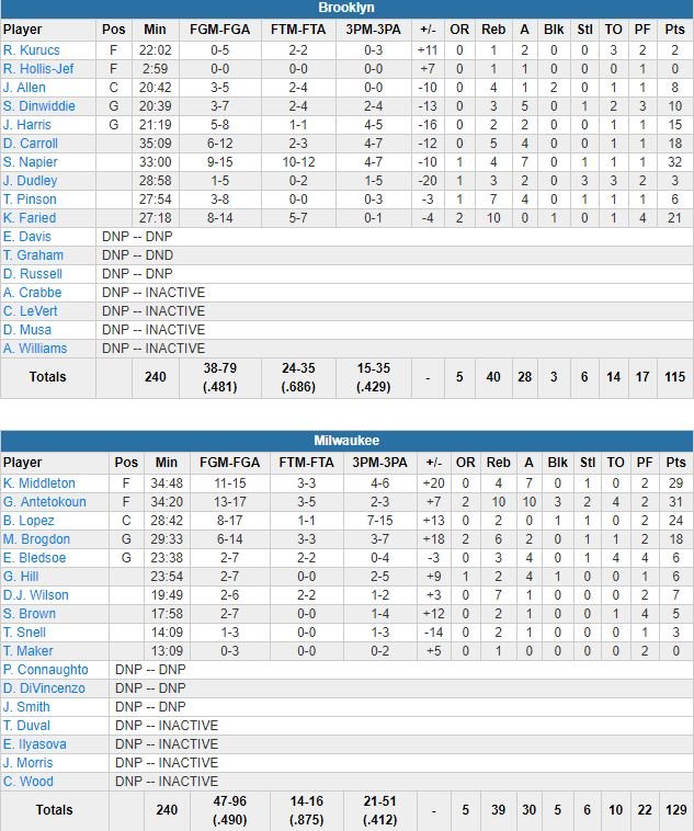 Khris Middleton, incertain avant le match pour un problème au quadriceps, a terminé à 29 points (11/15, 4 rebonds, 7 passes), Brook Lopez à 24 points à 7/15 à 3-points, dont un 5/9 à 3-points en 1ère mi-temps. Les Nets ont perdu Rondae Hollis-Jefferson (aine) dans le 1er quart-temps. Kenneth Faried a signé 21 points et 10 rebonds pour Brooklyn.