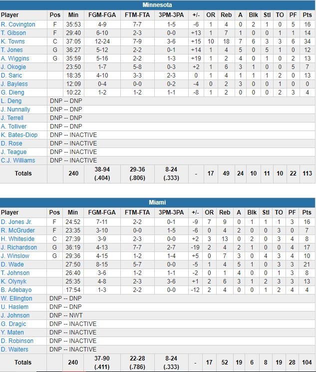 Minnesota a joué ce match sans Derrick Rose (cheville) et Jeff Teague (7ème match manqué, cheville). Hassan Whiteside a terminé à 8 points à 3/9, 13 rebonds et 2 contres en 27 minutes.