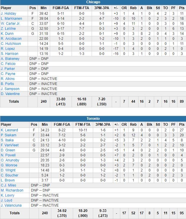 Devant 68-65 à l’entame du dernier quart, les Raptors ont enchaîné deux 3-points par Delon Wright et Siakam et menaient 74-65 à 10’10 de la fin. Carter a mis fin au trou noir de Chicago avec un hook shot à 8’41 mais les Bulls ont payé cher leur 12 shoots ratés sur leurs 15 premières tentatives dans la période. Markkanen de loin a ramené les siens à 85-82 à 1’21 mais Leonard a répondu avec 2 lancers-francs. Kris Dunn a manqué un shoot derrière et Siakam a assuré 2 lancers, 89-82 Toronto à 25 secondes. Sur le match, Toronto a dominé 13-2 aux points en contre-attaque et 17 rebonds offensifs à 10.
