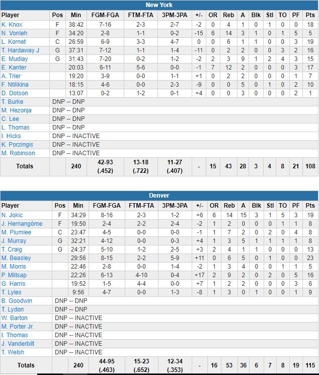 Les Knicks (8ème défaite d’affilée), menés par les 19 points de Luke Kornet, les 18 points à 7/16 de Kevin Knox et les 17 points et 12 rebonds d’Enes Kanter, n’ont plus gagné à Denver depuis le 8 novembre 2006. Frank Ntilikina a joué 18 minutes pour 10 points à 4/6 et 5 passes. Les Nuggets, 36 passes décisives sur le match (28 pour les Knicks) ont dominé le rebond 53-43.