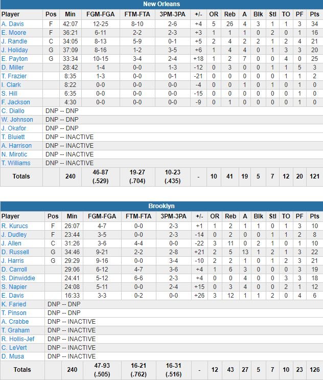 Devant 73-58 à la pause malgré les absences de Caris LeVert (pied), Rondae Hollis-Jefferson (aine) et Allen Crabbe (genou), ils ont pris jusqu’à 24 points d’avance et menaient encore de 18 points à la fin du 3ème quart avant de subir 12 dernières minutes plus compliquées, dominées 34-21 par New Orleans. Harris a enchaîné 2 paniers consécutifs lorsque les Pelicans sont revenus à 7 points à moins de 5 minutes de la fin. DeMarre Caroll a terminé à 19 points, Spencer Dinwiddie 18 (banc des Nets : 55 points, banc des Pelicans : 5). Elfrid Payton a signé 25 points pour New Orleans, Julius Randle 21 et Jrue Holiday 20.
