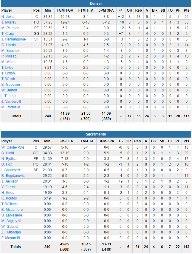 Les Kings étaient bien installés dans cette rencontre grâce à une bonne première mi-temps et surtout un gros second quart remporté sur le score de 36-23. Ils menaient 70-55 en seconde mi-temps quand Murray a commencé son show en marquant 8 points de suite dont deux tirs à 3-pts pour initier un 13-0 des siens. Denver a fini par prendre la tête en fin de quart mais à l’entame des 12 minutes le score était de 84-84. Murray a débuté le dernier acte par un tir à 3-pts qui a mis Denver définitivement en tête. Sous l’impulsion du Canadien ils ont pris jusqu’à 10 points d’avance à 6 minutes de la fin. Pas suffisant puisque Hield a relancé les siens à 3-pts et Sacramento est revenu à 108-106 avec 1’25 à jouer. Murray a alors planté deux tirs à 3-pts de suite pour plier l’affaire.