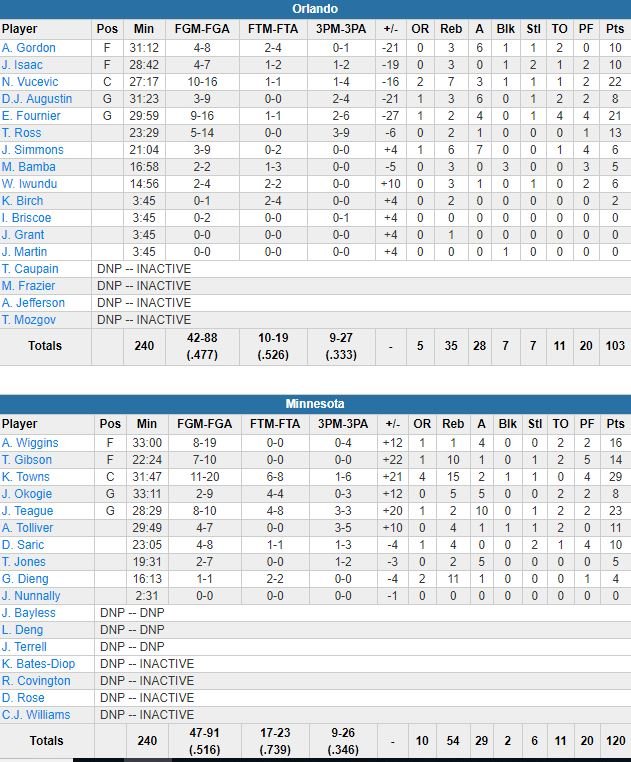Le changement s’est joué en défense pour Minnesota (1ère victoire en 3 matchs), avec un 44-12 en 5’51 dans le 3ème quart pour revenir dans le match. Le Magic – qui restait sur 3 victoires en 4 matchs – de Nikola Vucevic (22 points à 10/16, 7 rebonds) et Evan Fournier (21 points à 9/16, 4 passes) a manqué 12 de ses 14 derniers en 1ère mi-temps et a shooté à 7/23 dans le 3ème quart.
