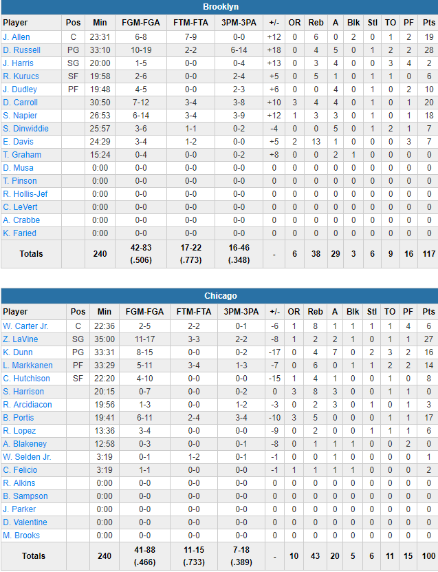 Tout va bien pour les Nets, qui continuent leur impressionnante remontée en dominant les Bulls à Chicago 106-96. Avec ce 3ème succès de suite ils ont presque équilibré leur bilan, de 20-21. Ils ont été menés par un excellent D’Angelo Russell (28 points à 10/19 dont 6/14 à 3-pts et 5 passes), aidé par le trio DeMarre Carroll (20 points à 7/12 dont 3/8 à 3-pts), Jarrett Allen (19 points à 6/8 et 6 rebonds) et Shabazz Napier (18 points à 6/14). La différence s’est fait en seconde mi-temps, remporter 62-45 par les Nets. Côté Bulls Zach LaVine est le meilleur marqueur avec 27 points à 11/17 alors que Kris Dunn signe 16 points et 7 passes.