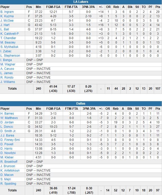 L’équipe n’a pas lâché au début du 4ème avec un 11-2 d’entrée pour se détacher 96-82 à 8’52 de la fin. Dallas est revenu à 7 points deux fois dans la période mais à chaque fois Ingram a réussi à attirer la défense vers lui pour libérer JaVale McGee (8 points à 4/7, 10 rebonds) sur des dunks. Luka Doncic a terminé meilleur marqueur des Mavs (11 ballons perdus en seconde mi-temps et un petit 11/43 aux tirs) avec 27 points à 10/23, 8 rebonds et 2 passes. Dallas a été battu 4 fois à domicile cette saison (16-4).