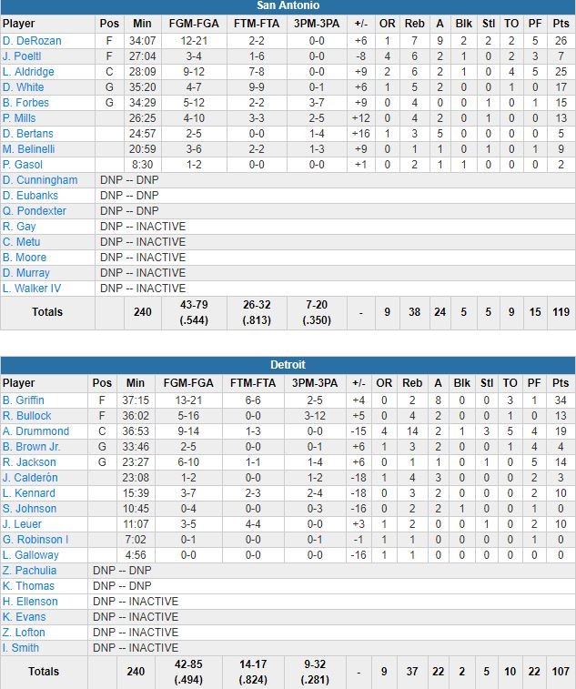 LaMarcus Aldridge a terminé à 25 points à 9/12 et 6 rebonds alors qu’en face Blake Griffin a signé 34 points à 13/21 et 8 passes pour Detroit, devant Andre Drummond et son traditionnel double-double (19 points à 9/14 et 14 rebonds). Le pivot a joué l’intégralité du 1er quart et les 5 premières minutes du 2ème sans pouvoir empêcher le gros run des Spurs.