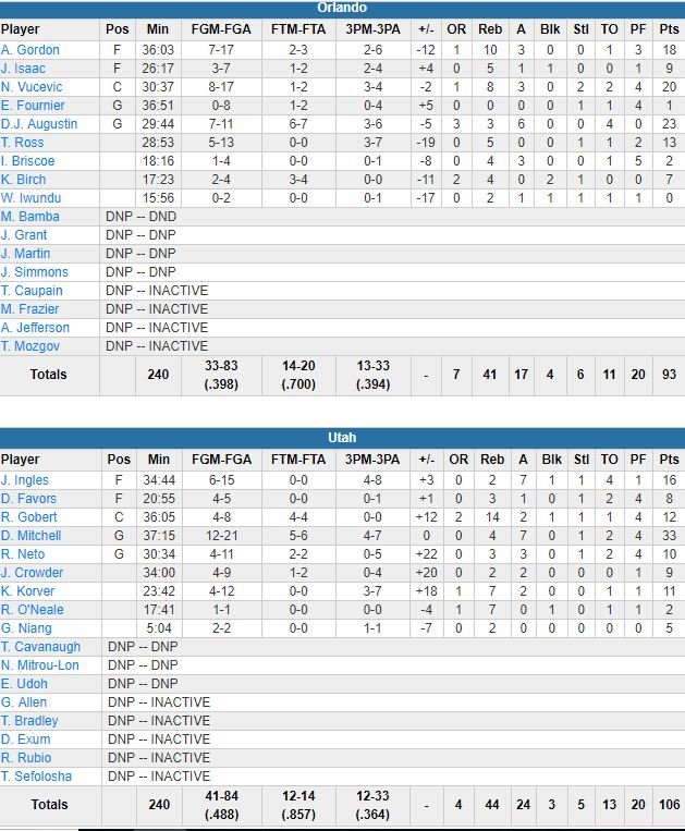 Joe Ingles a ajouté 16 points et 7 passes, Rudy Gobert 12 points et 14 rebonds alors qu’en face malgré les 23 points et 6 passes de D.J. Augustin, les 20 points et 8 rebonds de Nikola Vucevic et les 18 points et 10 rebonds d’Aaron Gordon, Orlando, pourtant en tête de 21 points dans le 2ème quart, termine son road trip avec 4 défaites en 6 rencontres.