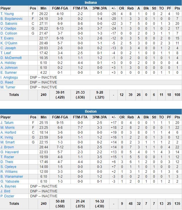 À 56.5% aux tirs (26/46), Boston était devant 68-63 à la pause (à un point près de leur season-high sur une mi-temps). Indiana est revenu dans le match avec un 10-2 en début de 3ème pour recoller à 79-67 sur un hook shot de Sabonis à 5’31 mais les Celtics ont passé la barre des 100 points avant la fin du quart-temps. Un 2+1 a initié un 12-3 en leur faveur et deux 3-points de Terry Rozier (12 points à 4/8, 5 rebonds et 5 passes en 19 minutes) sont venus enterrer les espoirs adverses, 100-74, à 1’27.