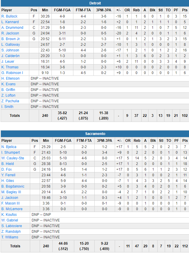Voilà une victoire qui fait du bien pour les Kings, pas au mieux ces derniers temps. Ils dominent une équipe au plus mal, les Pistons, sur le score de 112-102. Avec ce 2ème succès en 6 rencontres, les Kings équilibrent leur bilan à 21-21 alors que Detroit continue de dégringoler avec 17 victoires et 23 défaites.