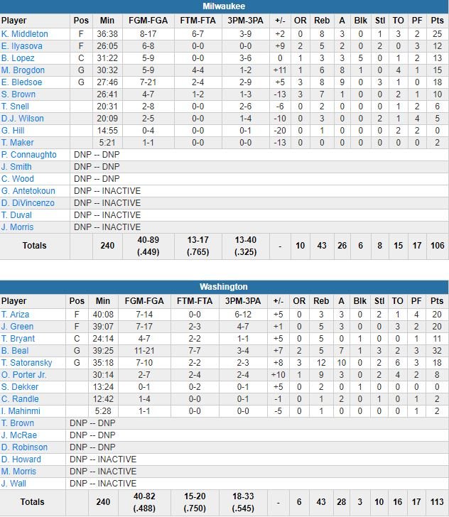 Certes, Giannis Antetokounmpo, touché à la hanche et au quadriceps, n’était pas là. Mais pour une équipe de Washington sans John Wall et 10ème à l’Est, battre la 2ème équipe de l’Est 113-106 reste un bel exploit. Alors que Tomas Satoransky a terminé en triple-double avec 18 points à 7/10, 12 rebonds et 10 passes, Bradley Beal a poursuivi sa belle série avec 32 points à 11/21, 5 rebonds et 7 passes dans cette 3ème victoire en 4 matchs pour les Wizards.