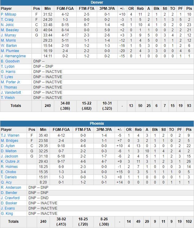 Dans une confrontation de type David contre Goliath, Denver s’est laissé surprendre à Phoenix cette nuit. Les Suns minus Devin Booker (dos) ont pris les devants avec un gros 1er quart-temps (31-23) et n’ont plus jamais lâché avant de s’imposer 102-93.