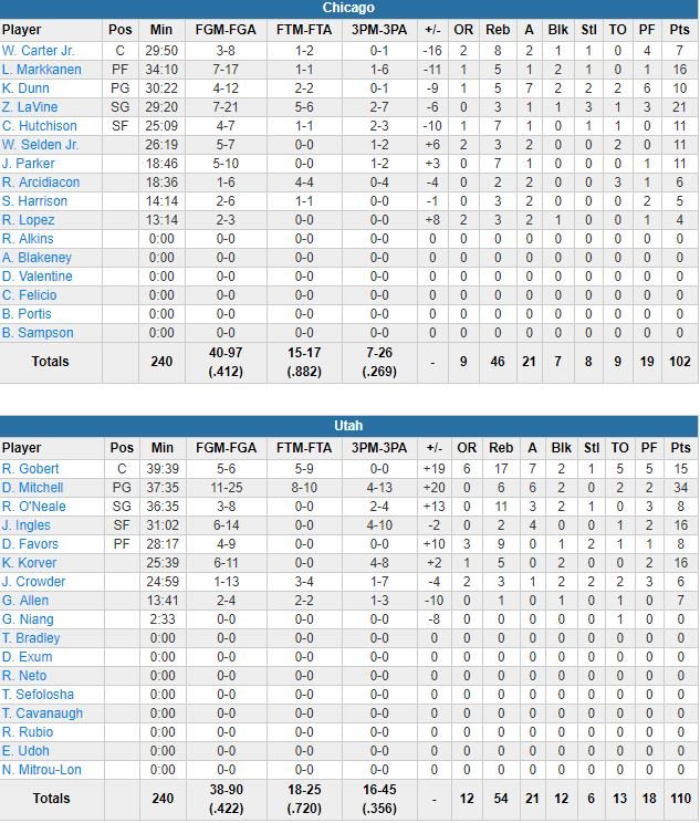 Les Bulls de Zach LaVine (21 points à 7/21) et Lauri Markkanen (16 points à 7/17) n’étaient pas si loin d’éviter une 7ème défaite de rang avec un retard de seulement 5 points (97-92) avant deux 3-points signés Royce O’Neale et Joe Ingles pour tuer le match à 2’23 de la fin. L’équipe a été dominée 54-32 aux points inscrits dans la peinture. Chicago avait tenu le Jazz à 35% en 1ère mi-temps et menait 53-51 à la pause, notamment grâce aux 7 points de Jabari Parker (qui n’avait joué qu’un des 13 derniers matchs de l’équipe avant cela) durant un 16-2 pour prendre l’avantage 31-19.