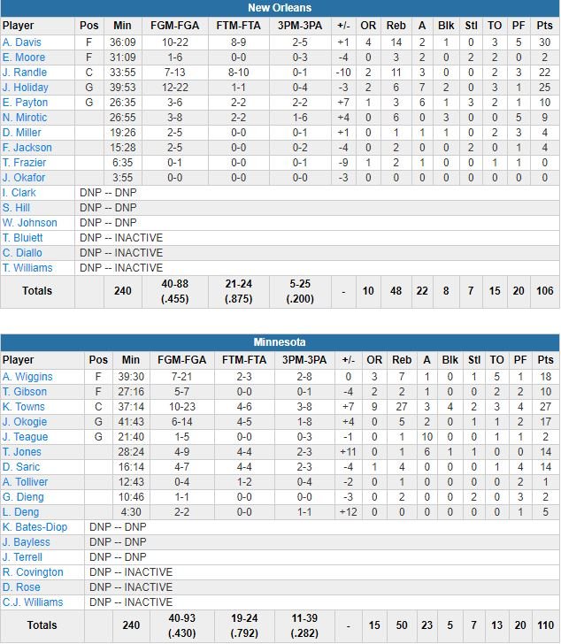 Towns a été clutch avec un 3-points face au cercle pour le +3 (106-103) à 2’55 de la fin et après lequel Minnesota n’a plus cédé l’avantage, puis un contre sur une tentative à 3-points d’Anthony Davis (30 points à 10/22 et 14 rebonds, 13ème double-double d’affilée) de l’autre côté pour 2 points signés Tyus Jones (14 points à 4/9 et 6 passes) en contre-attaque. Jrue Holiday, 25 points à 12/22, 6 rebonds et 7 passes, a ramené New Orleans à 108-106 sur un 2+1 à 2’23 mais Towns est venu contrer une autre tentative lointaine de Davis à 1’37 pour définitivement mettre les siens à l’abri.