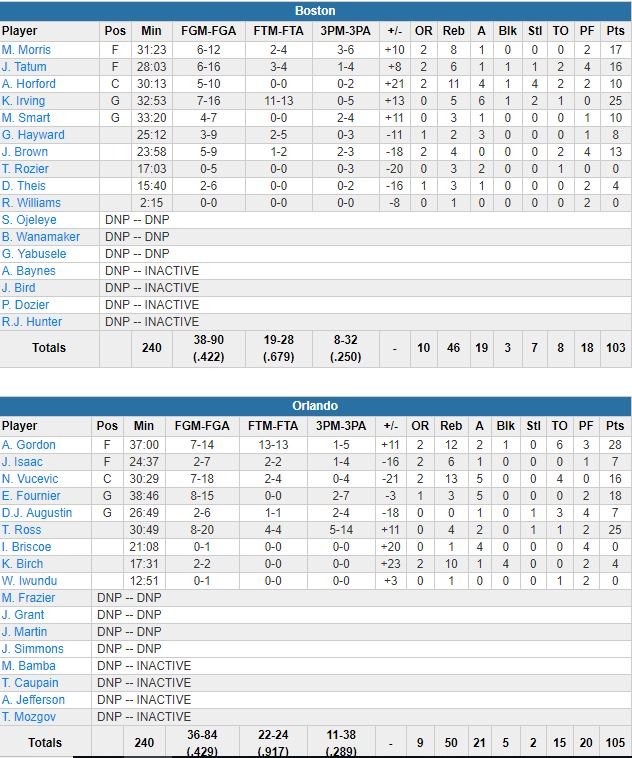 Les Celtics menaient toujours 61-53 quand Tatum a rejoint le banc avec 4 fautes en milieu de 3ème quart. Nikola Vucevic (16 points à 7/18, 13 rebonds et 5 passes) et Ross ont marqué 9 points chacun dans la période, dont un 3-points de Ross pour revenir à 5 points avant le début du 4ème. Lui et Gordon ont ensuite combiné pour 14 points durant un 19-4 dans le dernier quart pour reprendre 7 points d’avance à 5’57 de la fin. Un lancer raté de Vucevic à 3.2 secondes avait laissé une dernière chance à Boston.