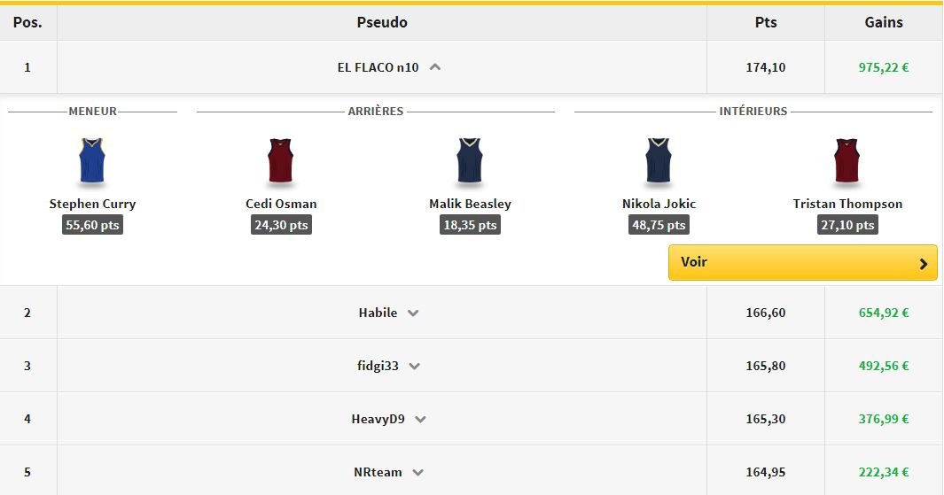 EL FLACO n10 rafle la mise avec le 5 suivant : Curry, Osman, Beasley, Jokic et Thompson. Il totalise 174,10 points fantasy, pour 975,22€ de gains !