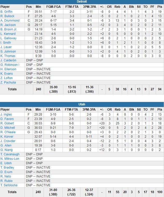 Ish Smith (8 points à 3/9) a fait son retour après 19 matchs d’absence (adducteur) pour Detroit. Utah a dominé le rebond 55-38.