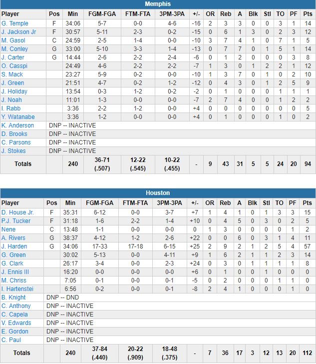 Garrett Temple et Mike Conley ont terminé co-meilleurs marqueurs des Grizzlies (8ème défaite sur les 9 derniers matchs) avec 14 points. Houston jouait sans 3 titulaires : Clint Capela (pouce), Chris Paul (ischio) et Eric Gordon (genou).