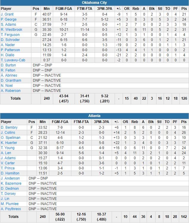 Atlanta (14-30), dont le meilleur marqueur a été John Collins avec 26 points à 12/14 juste devant Alex Len et ses 24 points à 9/14 et 11 rebonds, a shooté à 62.2% sur le match et 18/37 à 3-points, contre 45.7% et 9/32 de loin pour Oklahoma City.