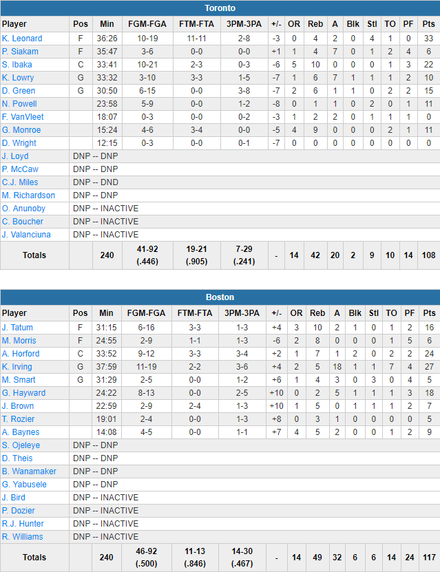 Après un premier quart offensif à l’avantage des visiteurs, qui ont conclu les 12 premières minutes en tête 36-30 (Leonard a marqué 9 points pour permettre aux siens de démarrer par un 18-7), les Celtics ont pris la mesure de leur adversaire grâce à une grosse défense dans le second quart et un collectif retrouvé. Ils ont passé notamment un 11-2, résultat un 34-17 dans les 12 minutes suivantes et un avantage 64-53 à la mi-temps. Les C’s ont mis la tête des Raptors sous l’eau avec un 10-5 pour débuter la seconde mi-temps et mener 74-58. Mais les C’s ont connu un gros coup de mou offensivement avec seulement 6 points en 5 minutes, résultat les Raptors ont recollé sur un 20-6 ! Les débats se sont équilibrés en dernier quart et Toronto a fini par prendre les commandes 104-100 suite à un 2+1 de Leonard avec 4’22 à jouer. Boston, mené par Kyrie Irving, auteur de 10 points et 6 passes en dernier quart, a permis un terrible 17-4 qui a terminé la rencontre. Le meneur a fait un festival pour enflammer le public et offrir la victoire aux siens.