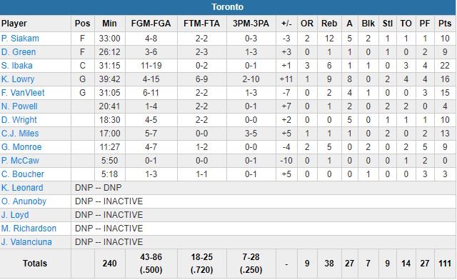 Toronto a eu chaud mais s’en est sorti sur un layup main gauche contre la planche de Pascal Siakam (10 points et 12 rebonds) au buzzer (vérifié en vidéo par les arbitres) pour offrir la victoire aux siens (6ème en 7 matchs) 111-109 cette nuit. Le shoot a surpris Phoenix, qui s’attendait à ce que le dernier shoot revienne à Kyle Lowry (16 points à 4 sur 15, 9 rebonds, 8 passes). Quelques instants plus tôt, Serge Ibaka (22 points à 11 sur 19) avait donné l’avantage aux siens 109-107 avant l’égalisation de Mikal Bridges sur 2 lancers-francs à 13 secondes de la fin.