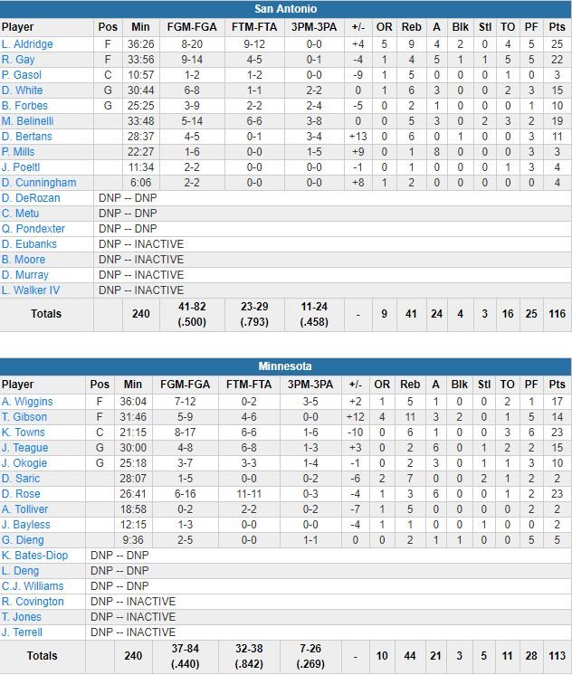 LaMarcus Aldridge (25 points à 8/20, 9 rebonds, 4 passes), Rudy, Gay (22 points à 9/14, 4 rebonds, 5 passes), Marco Belinelli (19 points à 5/14 en sortie de banc) et les Spurs ont fait ce qu’il fallait en l’absence de DeMar DeRozan (cheville) pour offrir une 520ème victoire à l’extérieur en carrière à Gregg Popovich, désormais à égalité avec Pat Riley à la 1ère place au nombre de victoires à l’extérieur en carrière pour un coach. Les Spurs se sont imposés 116-113 sur le parquet des Wolves.