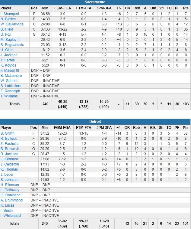 Blake Griffin, 38 points (dont 14 dans le 1er quart) à 12/23, 6 rebonds et 3 passes en l’absence d’Andre Drummond (commotion), a redonné l’avantage aux siens juste derrière, 101-100. Reggie Jackson a raté un tir sur la possession suivante des Pistons, qui pouvaient creuser l’écart. Hield n’est pas passé à côté de l’occasion. Ses coéquipiers De’Aaron Fox et Marvin Bagley ont signé 14 points chacun.