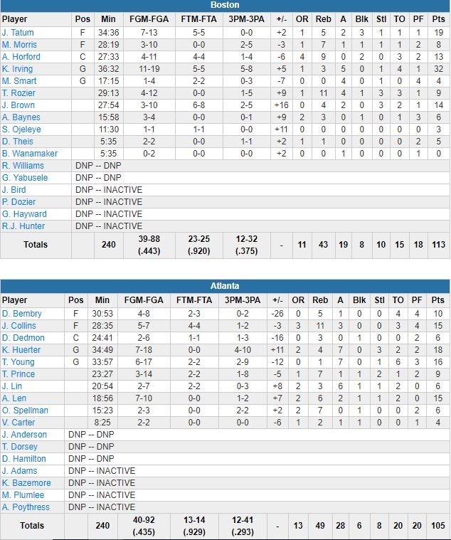 Irving a tenu son équipe, menée 50-34, à bout de bras en marquant 15 des 19 derniers points de Boston en 1ère mi-temps pour permettre aux C’s de revenir à 67-60. Toujours devant 89-83 après 3 quarts-temps, les Hawks (18 points de Kevin Huerter, 16 de Trae Young) ont encaissé un 30-16 sur les 12 dernières minutes, en ne shootant qu’à 6/20, dont un 1/11 à 3-points.