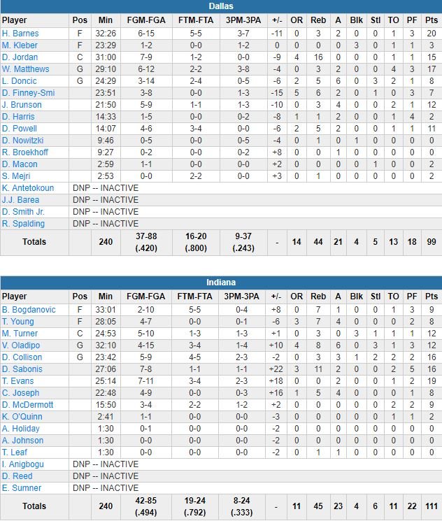 Une 3ème victoire en 4 matchs pour Indiana, porté par les 19 points à 7/11 de Tyreke Evans et les 16 points à 7/8 et 11 rebonds de Domantas Sabonis (tous les deux en sortie de banc). Menés de jusqu’à 19 points, les Mavericks sont revenus à 92-83 sur un layup de Devin Harris à 8’28 de la fin mais les Pacers ont répondu par un 13-5 pour assurer leur victoire.