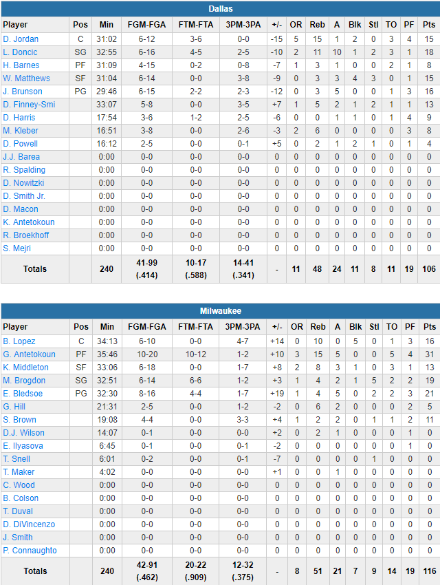 Les Bucks ont plutôt bien maîtrisé cet match, même s’ils n’ont jamais réussi à véritablement se défaire de Mavs accrocheurs. Ils ont pris les commandes sur un 8-0 qui a porté le score à 20-9 en premier quart, puis 35-26 après 12 minutes. Malgré leur domination, ils ont vu les Mavs recoller sur un 10-2 grâce à Wesley Matthews en début de second quart. Les débats se sont alors équilibrés et les deux équipes ne se sont pas lâchées jusqu’au milieu du 3ème acte. Doncic et Jordan ont mis Dallas à 1 petit point (73-72) avec un peu plus de 5 minutes à jouer. Mais Giannis, sur un 3-pts a initié un mini-run qui a permis aux locaux de virer en tête 92-84 après 3 quarts. Les Bucks ont enfoncé le clou avec des 3-pts de Brogdon et Lopez pour prendre 17 points d’avance à 7’12 de la fin. Dallas est revenu à 5 petits points grâce à Doncic à 3 minutes du terme mais Giannis, obligé de sortir du banc, a pris les choses en main et Milwaukee a pu plier le match sans se faire trop peur.