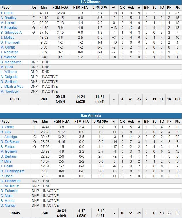 Les Spurs sont au mieux revenu à 101-95 à 31.7 secondes de la fin sur le dernier panier de LaMarcus Aldridge (30 points à 13/21, 14 rebonds), mais L.A. a échappé à presse tout-terrain adverse et bouclé le match aux lancers. DeMar DeRozan a été limité à 8 points à 4/16 en 29 minutes de jeu. San Antonio a perdu 18 ballons, contre 11 pour L.A.