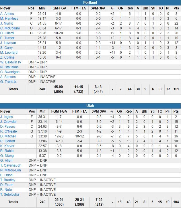 Sans Lillard sur le terrain, l’équipe a passé un 10-2 (dont un 3-points de Meyers Leonard) aux locaux pour prendre l’avantage 96-88 dans le dernier quart. En face le Jazz a manqué shoot ouvert sur shoot ouvert. À son retour sur le parquet, Lillard a mis de dedans de loin et donné 11 points d’avance à son équipe, 101-90. Donovan Mitchell (36 points à 12/28, 7 rebonds, 5 passes) a tout fait pour maintenir son équipe avec une impressionnante variété de tirs mais il était le seul en réussite. C.J. McCollum (14 points à 6/17, 4 rebonds, 4 passes) a creusé le plus gros écart du match 106-94 à 2’45 de la fin. Deux lancers de Mitchell ont ramené Utah à 108-104 mais après un contre de Rudy Gobert (10 points à 4/10, 13 rebonds, 3 passes, 4 contres), Joe Ingles a manqué un 3-points ouvert, le 7ème tir longue distance d’affilée raté par l’équipe.