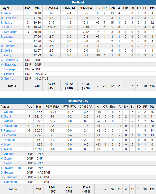 OKC a été mené par son super duo Paul George (36 points à 10/21 dont 3/6 à 3-pts, 8 rebonds, 4 passes et 5 interceptions) – Russell Westbrook (29 points à 9/20, 10 rebonds et 14 passes). Ils ont aussi pu compter sur l’aide précieuse de Steven Adams et Terrance Ferguson, qui ajoutent 14 points chacun alors que Dennis Schröder marque 13 points en sortie de banc. L’équipe shoote à 50.6% dont un joli 11/23 à 3-pts et ne perd que 10 ballons. En face Portland est limité à 45.3% mais capte pas moins de 20 rebonds offensifs pour contrebalancer ses 19 ballons perdus. Le trio Damian Lillard (34 points à 12/24 dont 2/10 à 3-pts, 5 rebonds, 8 passes, 5 interceptions et 5 ballons perdus), C.J. McCollum (31 points à 11/23 dont 7/12 à 3-pts) et Jusuf Nurkic (22 points à 9/17 et 15 rebonds) sort un gros match mais ils ont été bien trop seuls pour une 4ème victoire de suite.