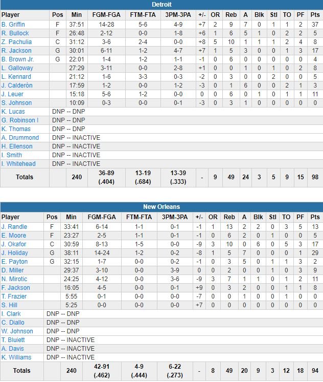 New Orleans a recollé à 95-92 sur un drive d’Holiday et un 3-points de Darius Miller à 52.5 secondes. Les Pistons n’ont pas trouvé mieux qu’un shoot à 3-points forcé et raté de Griffin derrière, mais Frank Jackson (31ème choix de la draft 2017) a manqué l’occasion d’égaliser sur un 3-points ouvert. Reggie Bullock a récupéré le ballon avant d’aller claquer un dunk décisif à 14.5 secondes du buzzer. Au final Detroit a shooté à 7/23 dans le dernier quart, pour seulement 19 points (24-19).