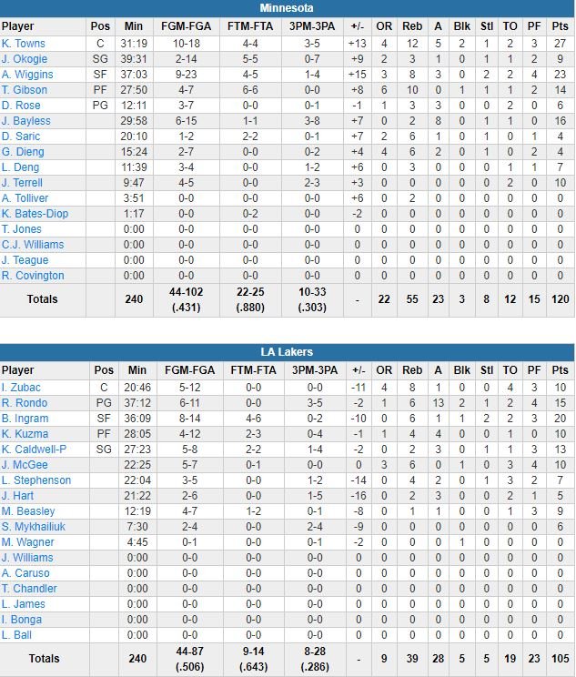 De retour après 14 matchs manqués (main), Rajon Rondo a joué 37 minutes pour 15 points à 6/11, 6 rebonds et 13 passes. Brandon Ingram a terminé meilleur marqueur de Los Angeles (dominé 55-39 au rebond) avec 20 points à 8/14 et 6 rebonds, Kyle Kuzma a été limité à 10 points à 4/12. Menés 84-82 après 3 quarts-temps, les Lakers avaient marqué les 4 premiers points de la période avant de prendre un 11-1 (7 points de Towns dont un 3-points). Ils ont aussi perdu 7 ballons dans la période.
