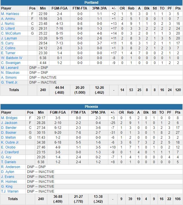 Les Blazers de Damian Lillard (24 points à 7/16, 3 rebonds, 3 passes, 2 contres), C.J. McCollum (20 points à 8/15) et Jake Layman (20 points à 9/15, 8 rebonds) ont mis du temps à se débarrasser des Suns à Phoenix cette nuit mais ils ont fini par l’emporter 120-106. C’est la 9ème fois d’affilée que Portland, désormais sur 4 victoires en 5 matchs et 8 en 11 rencontres, dominent l’équipe de l’Arizona, de son côté sur 9 revers d’affilée après cette défaite.