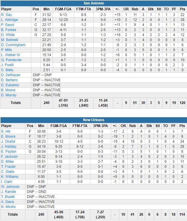 Rudy Gay a bien aidé aussi avec 22 points à 6/13 dont 11 dans le 3ème quart-temps et 11 rebonds pour aider San Antonio à mettre fin à une série de 2 défaites. Aldridge a lui marqué 12 points durant un run décisif dans le 3ème quart (25-12 qui a permis aux visiteurs de passer d’une avance de 3 points à la mi-temps à un score de 85-69 en leur faveur). L’équipe (51-41 au rebond) a shooté à 55% dans la période, dominée 36-28. En face c’était l’hécatombe avec les absences d’Anthony Davis, Julius Randle, Nikola Mirotic et E’Twaun Moore. Les Spurs devant de 21 points dans le dernier quart, Aldridge a pu aller se rasseoir définitivement sur le banc. Jrue Holiday a terminé meilleur marqueur des Pelicans avec 29 points (9/20, 7 rebonds, 3 passes), devant Jahlil Okafor et son nouveau très bon match avec 24 points à 10/12, 15 rebonds et 3 contres.