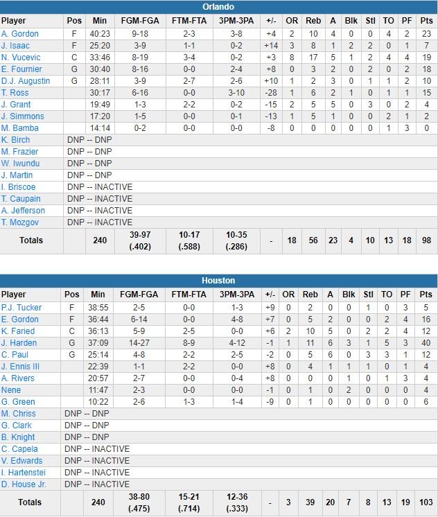 Harden, qui a contribué à limiter Nikola Vucevic (19 points à 8/19, 17 rebonds et 5 passes) à seulement 2 points en seconde mi-temps, signe là son 12ème match en 17 rencontres à au moins 40 points. Orlando était devant de 7 points à la pause et est monté jusqu’à 76-61 en milieu de 3ème quart-temps après un 9-0 marqué par 5 points d’Aaron Gordon (23 points à 9/18, 10 rebonds, 4 passes). Eric Gordon (16 points à 6/14) a marqué les premiers points en 4 minutes de son équipe après ça sur un 3-points, démarrant un 11-4 qui a réduit l’écart à 80-72. Toujours menés de 8 points à l’entame du 4ème, les Rockets ont réussi un 11-3 et égalisé à 87 partout à 7 minutes de la fin. Chris Paul (12 points à 4/8, 5 rebonds, 6 passes en 25 minutes), de retour après 17 matchs d’absence (ischio) a planté deux 3-points durant ce run, Gerald Green un.