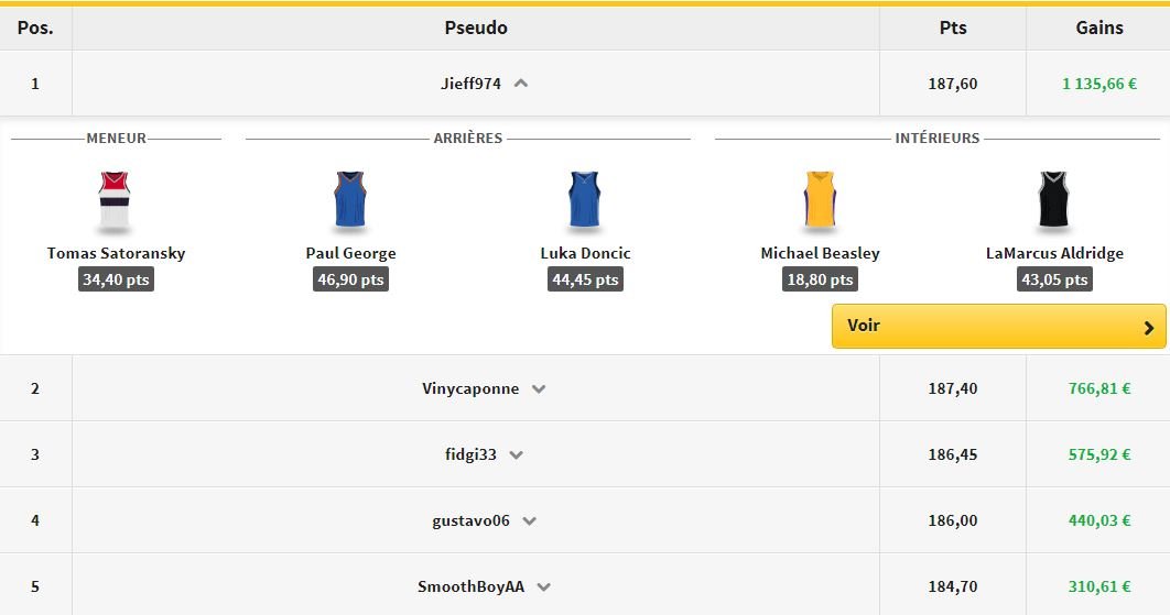 Jieff974 rafle la mise avec le 5 suivant : Satoransky, George, Doncic, Beasley et Aldridge. Il totalise 187,60 points fantasy et il empoche 1 135,66€.