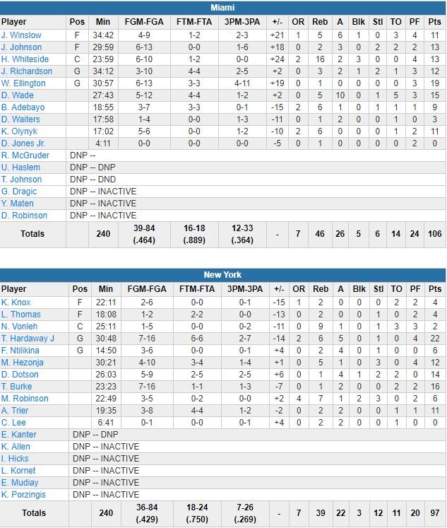 Du côté de New York c’est Miami qui s’est imposé pour un 2ème match consécutif dans le sillage de Wayne Ellington (19 points) et là encore d’un total de 7 joueurs à minimum 10 points. Dwyane Wade a terminé à 15 points et 10 passes, Hassan Whiteside 13 points et 16 rebonds. Pour les Knicks (22 points de Tim Hardaway Jr.), c’est une 9ème défaite d’affilée. Menés 85-72 avant de réussir un 18-5 pour égaliser à 90 partout sur un 3-points d’Hardaway à 4’01 la fin, ils ont ensuite encaissé un 10-2 fatal qui a permis à Miami de reprendre le contrôle. Whitesie a redonné l’avantage aux siens sur un layup puis Ellington a planté un 3-points pour le +8, 100-92, à 1’08.
