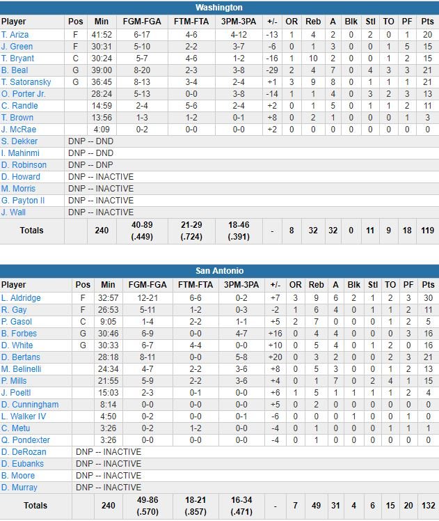On commence par une visite des Wizards à l’AT&Center, où les Spurs restaient sur 2 défaites. Série terminée puisque LaMarcus Aldridge (30 points à 12/21, 9 rebonds, 6 passes, 2 contres) et ses 6 coéquipiers à au moins 10 points dont Davis Bertans (21 points à 8/11) se sont imposés de 13 points cette nuit face à Bradley Beal (21 points), Tomas Satoransky (21 points), Trevor Ariza (20 points) et un total de 7 Wizards à minimum 10 points. Deux runs (11-2 puis 15-2) dans le 1er quart ont permis à San Antonio de prendre 13 points d’avance mais la défense n’était pas suffisamment au rendez-vous (43-34 encaissé dans le 2ème quart) pour empêcher Washington de revenir à 69-67 à 1’25 de la pause. Les Spurs ont fait la différence en tenant leurs adversaires à 17 points à 7/24 aux tirs dans le 3ème quart. Leur banc a dominé celui des Wizards 54 à 27.