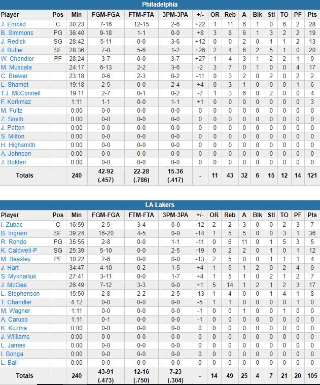 Les locaux ont payé leur très mauvais début de match : Philadelphie a remporté le 1er quart-temps 39 à 20 (dont un 12-0) et profité des 9 ballons perdus de Los Angeles sur la période. Sans LeBron James, Kyle Kuzma et Lonzo Ball, l’équipe – qui n’a pas mené une fois – ne s’en est pas remis malgré un 33-25 (dont un 16-0 alors que l’équipe était menée 48-24 à 8’14) dans le 2ème quart-temps pour revenir à 64-53 à la mi-temps après avoir pris jusqu’à 24 points de retard.