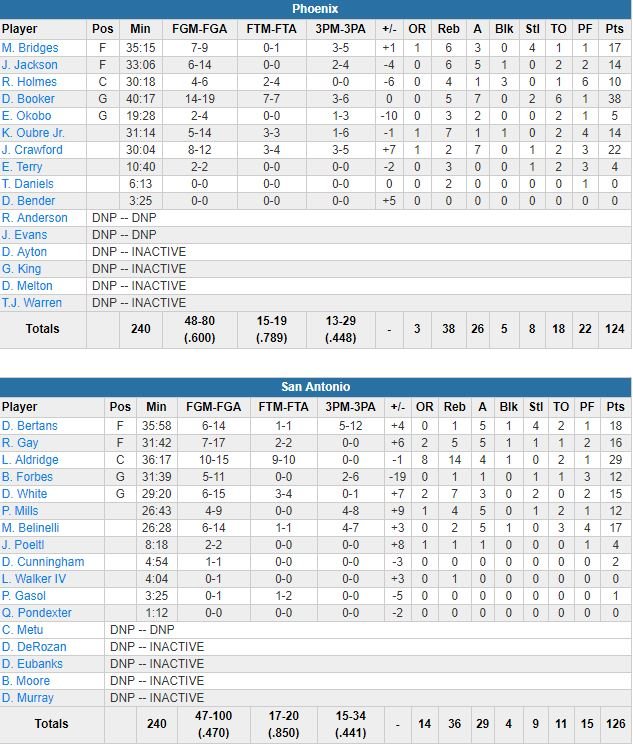 San Antonio (47% aux tirs) devant 94-82 après un 14-2 en milieu de 3ème, Phoenix était revenu à 96-95 en début de 4ème, puis 106-105 en milieu de période et enfin 119-118 à 2 minutes de la fin. Sept Spurs ont signé au moins 10 points, dont chacun des 5 titulaires. Davis Bertans a terminé à 18 points (5/12 à 3-points, 5 passes 4 interceptions), Belinelli 17 (4/7 à 3-points).