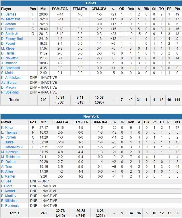 Luka Doncic, qui a démarré son match sur un airball, a finalement terminé avec 16 points à 7/18, 8 rebonds et 5 passes en 28 minutes, alors que son collègue Dennis Smith Jr. était en triple-double (le 2ème de sa carrière) avec 13 points à 5/12, 10 rebonds et 15 passes. Harrison Barnes a terminé meilleur marqueur des siens avec 19 points à 7/14. Devant 24-20 après 12 minutes, les Mavs (3ème victoire en 4 matchs) étaient toujours en tête 55-47 à la pause et ils ont définitivement tué le match à la reprise avec un 35-23 dans le 3ème quart-temps pour monter jusqu’à +29.