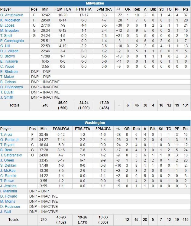 Après un 17-2 passé aux Wizards en fin de 2ème quart-temps, Milwaukee (30 assists) était devant de 23 points à la pause puis de 32 à la fin du 3ème quart-temps. Antetokounmpo a marqué 7 des 10 derniers points du gros run du 2ème quart, dont un dunk sur Jeff Green (20 points à 6/17) avec la faute. Le meilleur marqueur des Wizards n’était autre que Bradley Beal (24 points à 8/16, 4 rebonds, 3 passes), Otto Porter Jr. a lui signé 18 points à 7/14 et 7 rebonds.