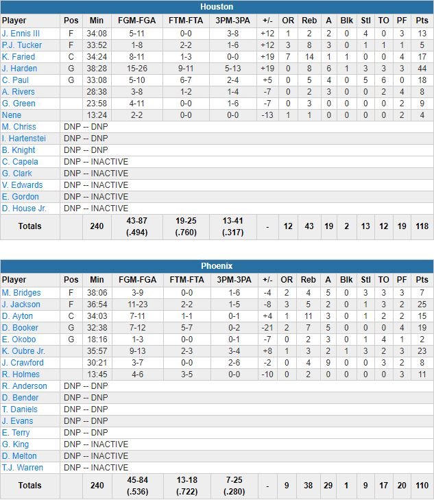 Chris Paul a ajouté 18 points (5/10, 5 rebonds, 4 passes), Kenneth Faried 17 points (8/11, 14 rebonds). En face, Josh Jackson a mené les Suns avec 25 points, devant Kelly Oubre Jr. (23 points à 9/13), Devin Booker (19 points à 7/12, 7 rebonds, 5 passes) et Deandre Ayton (15 points à 7/11, 11 rebonds). Booker a quitté le match sur une blessure (ischio) dans le 4ème. Phoenix n’a pas mené une seule fois mais s’est rapproché en 1ère mi-temps avant de prendre 20 points de retard dans le 3ème quart. L’équipe est revenue sous les 10 points plusieurs fois dans le 4ème mais Harden (14 points dans la période) et Paul avaient toujours une réponse.