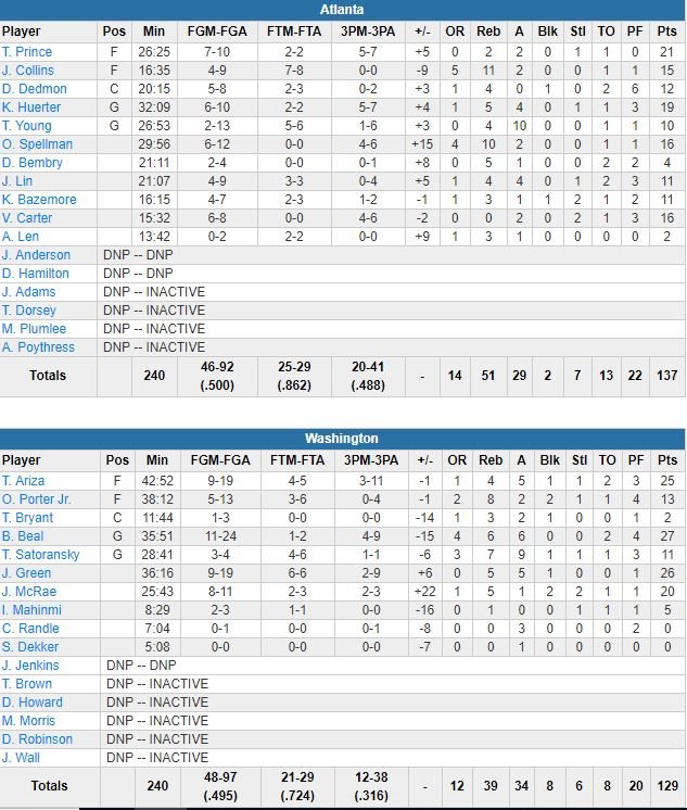 À 42 ans, Vince Carter a signé 16 points (6/8 et 4/6 à 3-points) en 16 minutes après la mi-temps pour aider Atlanta à tenir son avance à Washington. Les Hawks (51-39 au rebond et 20/41 à 3-points) bouclent donc leur road trip avec une 4ème victoire en 7 matchs. John Collins out après la pause suite à une coupure au visage, le vétéran est entré en milieu de 3ème et a enchaîné 3 shoots, dont deux 3-points. Taurean Prince a lui marqué 12 de ses 21 points dans le dernier, et Kevin Huerter a ajouté 19 points pour Atlanta. Les deux ont chacun marqué 5 des 20 tirs à 3-points de l’équipe sur le match. Omari Spellman a signé 16 points et 10 rebonds, Trae Young 10 points et 10 passes. Bradley Beal a marqué 18 de ses 27 points dans le dernier quart, Jeff Green a terminé à 26 points, Trevor Ariza 25, Jordan McRae 20. Les Wizards ont pris jusqu’à 19 points de retard.